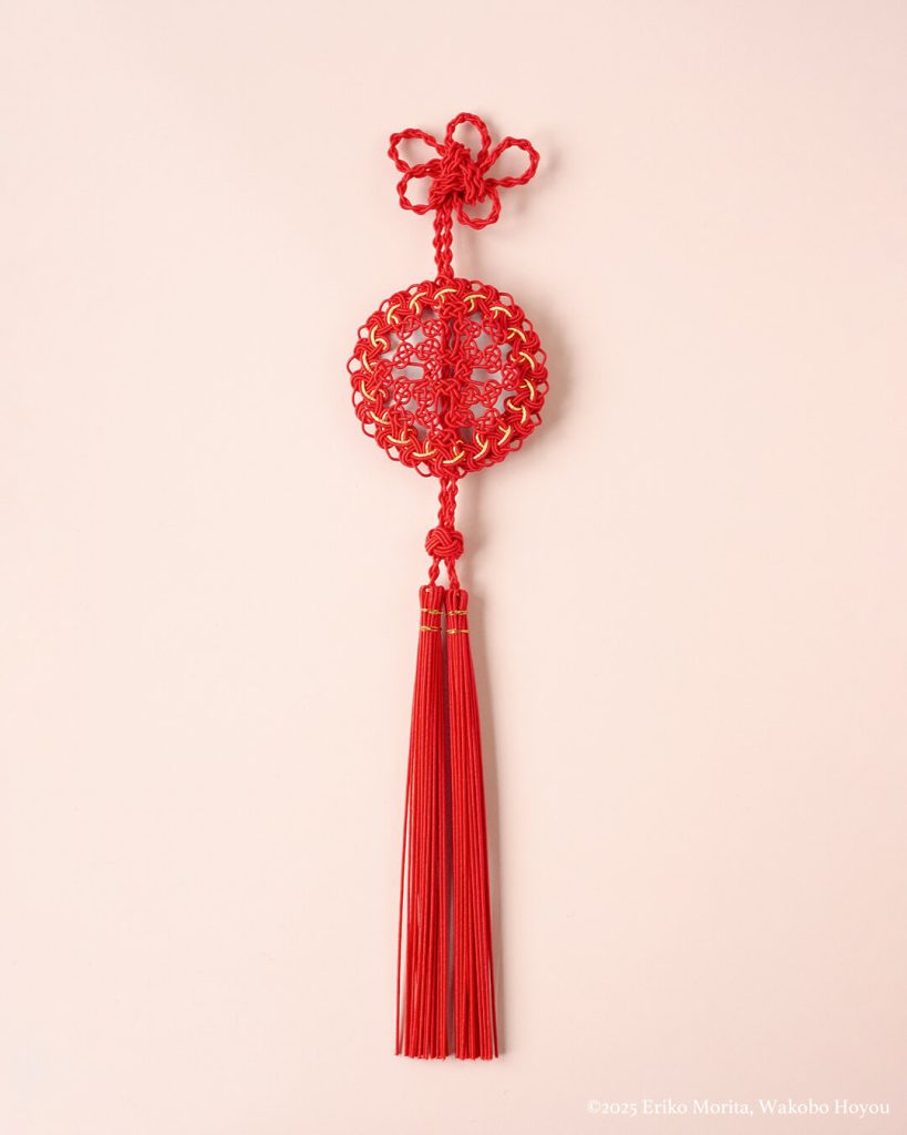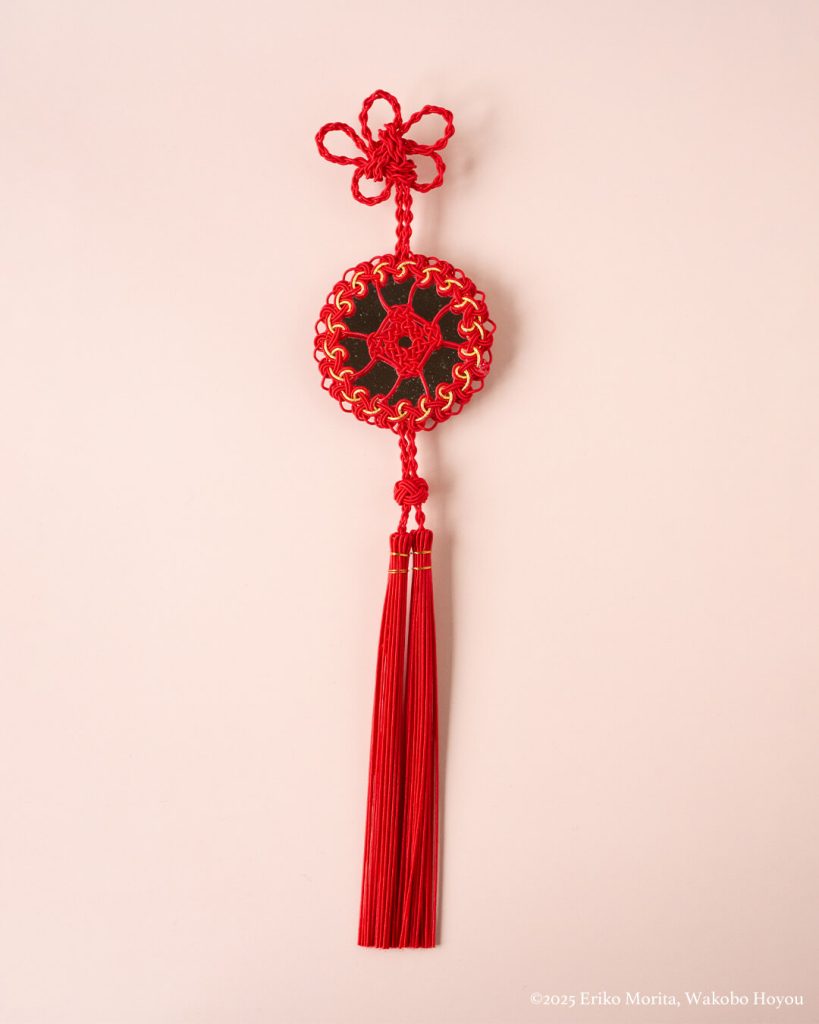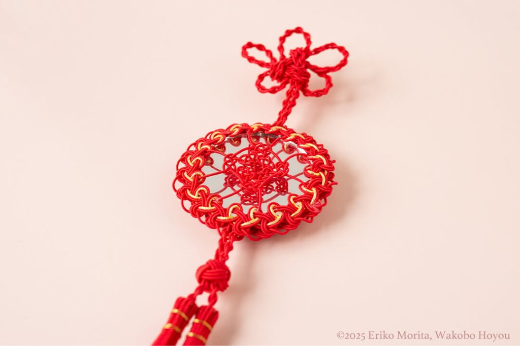 小さな鏡を組み込んだ中国結びの飾は、家庭や店先に吊るして幸福を招く飾りとして広く見られます。こちらは日本の飾り結びの技法と水引を組み合わせて再構成したものです。