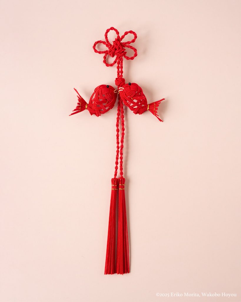 和工房 包結では長く定番の人気を誇る鯛を、鮮やかな赤の水引で仕立てたつるし飾り。