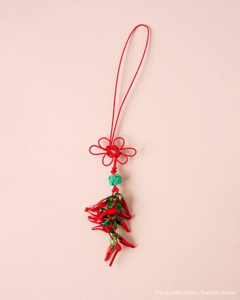 持ち主を守ってくれる厄除けのお守りとして親しまれてきたガラスの唐辛子飾りを、水引で結びました。