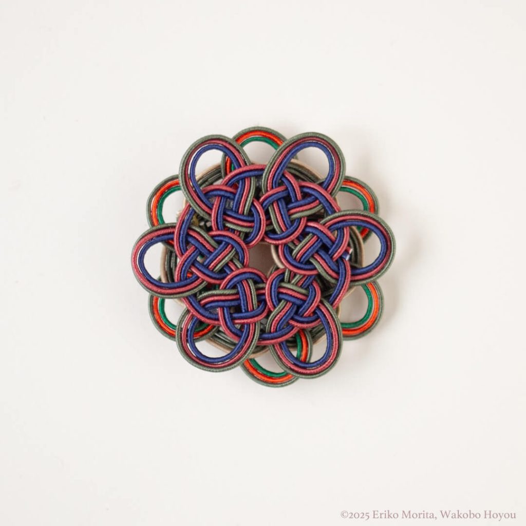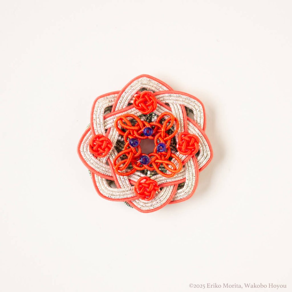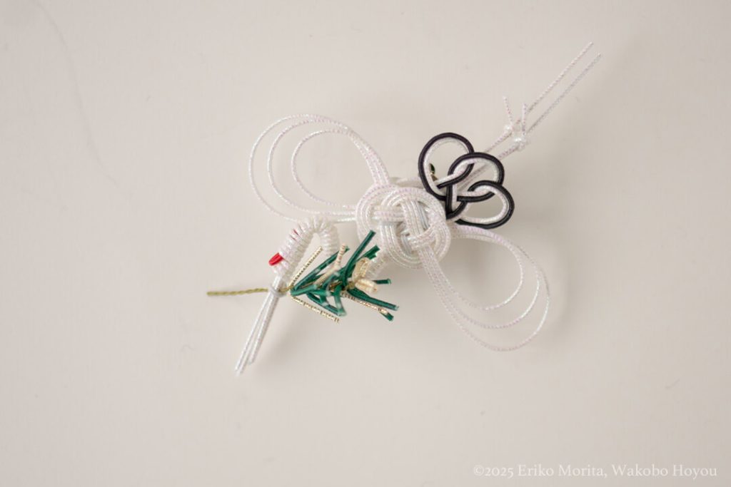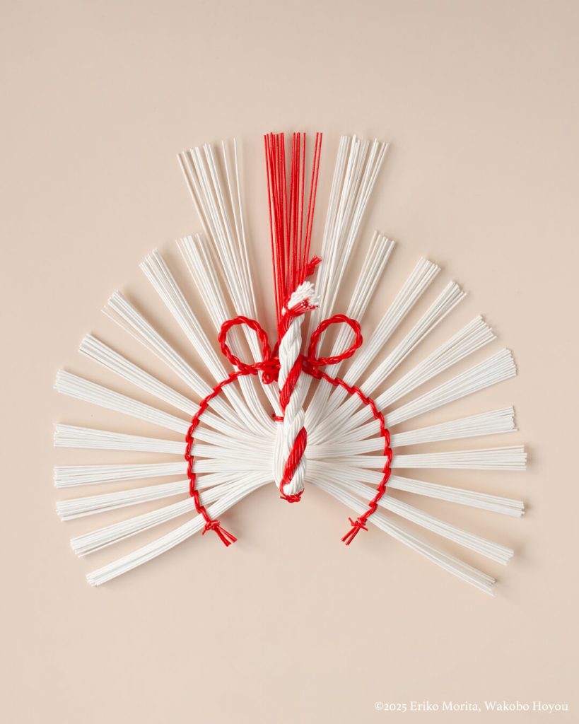 森田江里子は、日本各地に伝わる伝統的なしめ飾りのかたちを参照し、水引で再解釈して結んだ作品も多く制作しています。