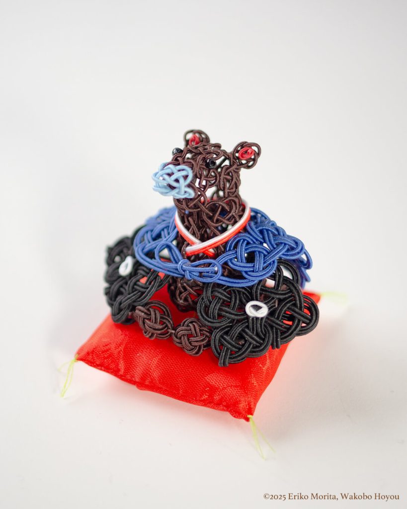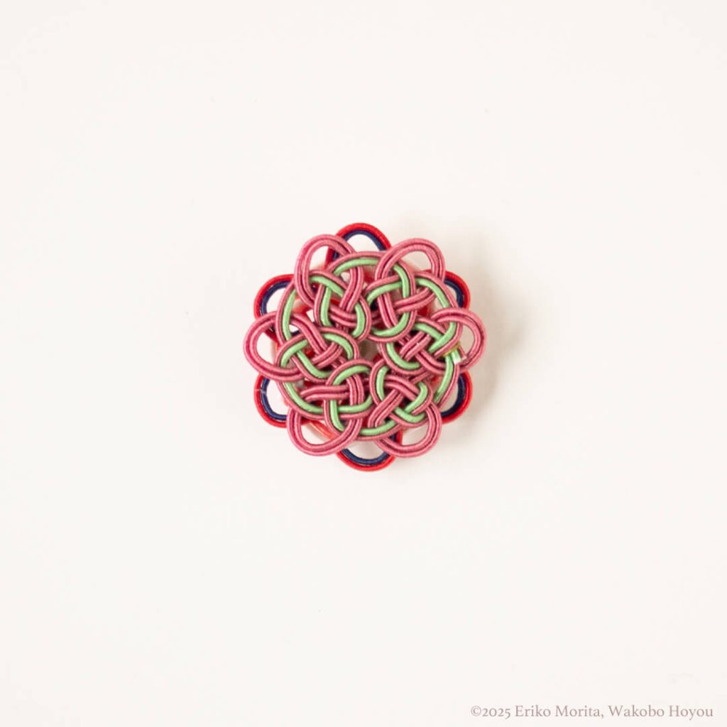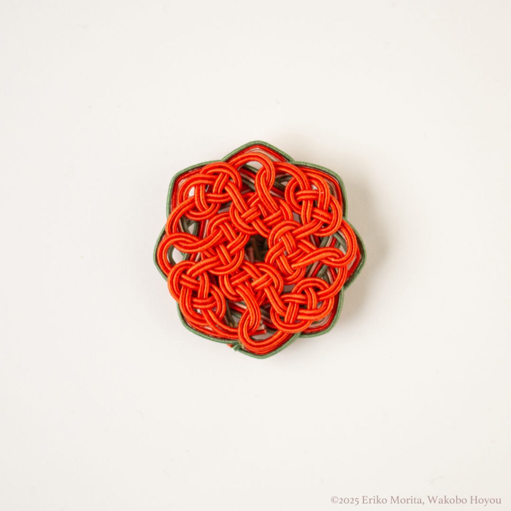 森田江里子は、日本各地に伝わる伝統的なしめ飾りのかたちを参照し、水引で再解釈して結んだ作品も多く制作しています。