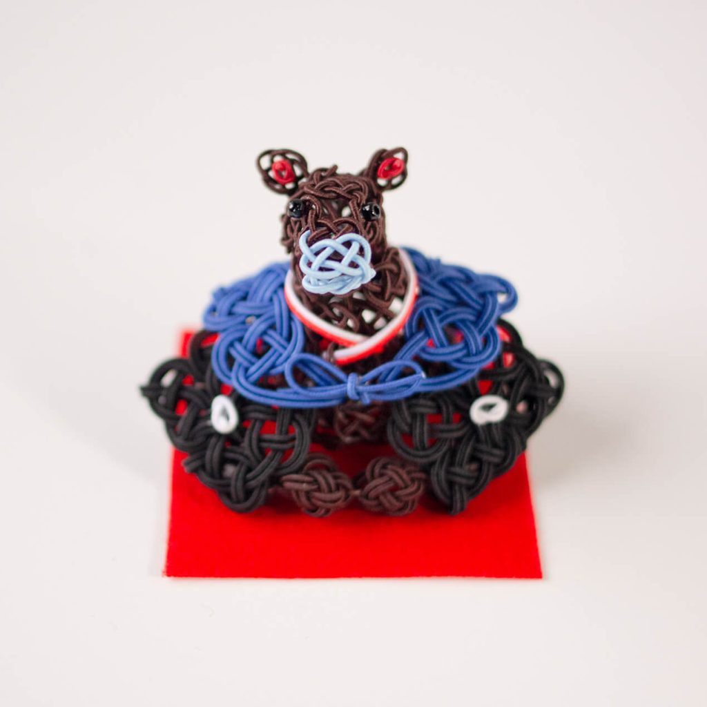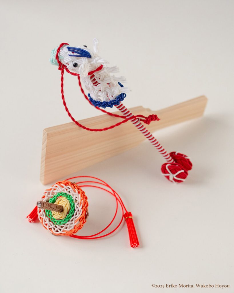 水引で結んだ春駒。春駒は、張り子などで馬の頭の形をつくり、下に車を付けて子どもが引いて遊んだとされる、古くから伝わる玩具です。