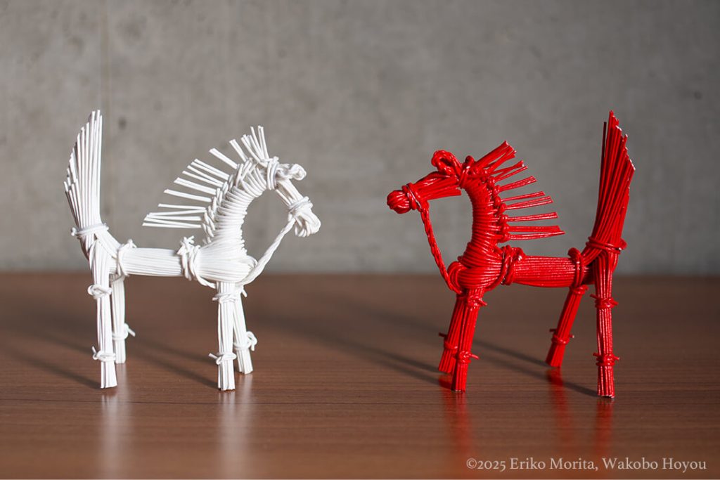 紅白の水引で結んだ二頭の馬が、伝統的なモチーフにどこかモダンな表情を添えています。